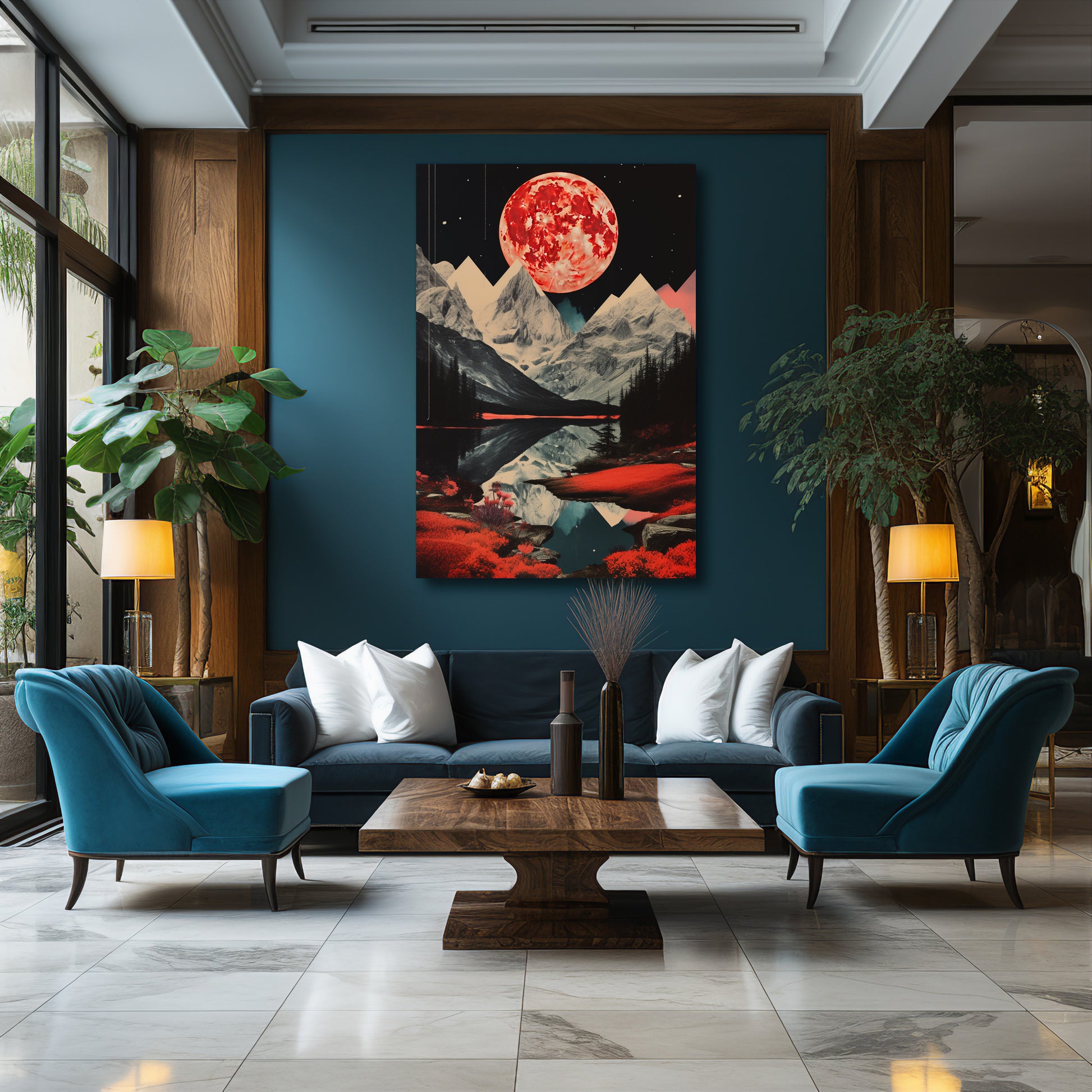 Châssis aluminium ou accroches pliables selon le format : châssis invisible avec écartement du mur de 2 cm, pour un effet suspendu.